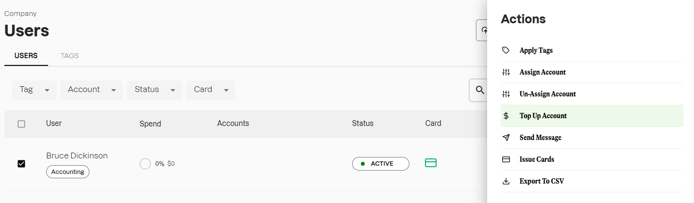 - Search for the relevant User and tick the box to the left of their name to open the 'Actions' menu. Select 'Top Up Account'